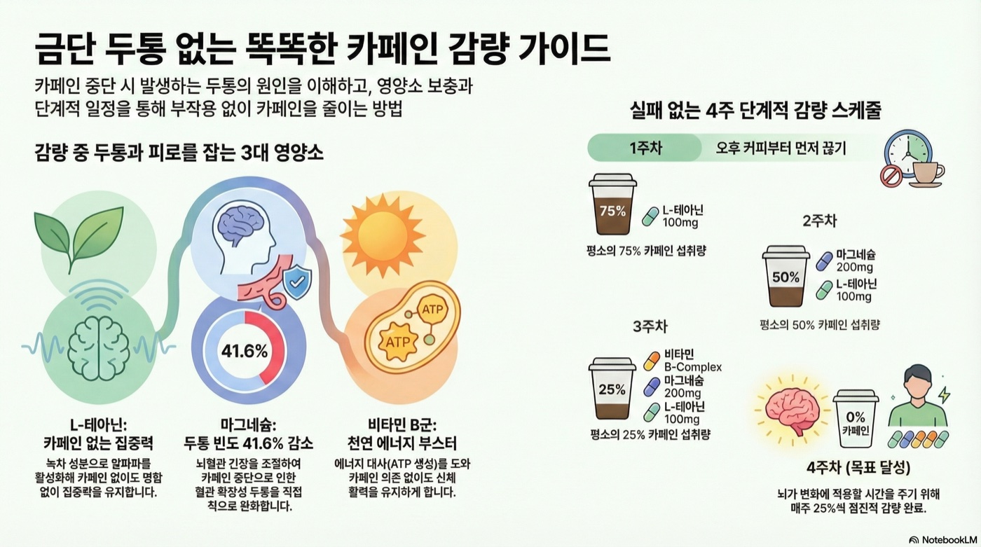 카페인을 매주 25%씩 줄이면서 L-테아닌(집중력) + 마그네슘(두통 완화) + 비타민B(에너지)를 병행하면 금단 증상 없이 감량할 수 있습니다.