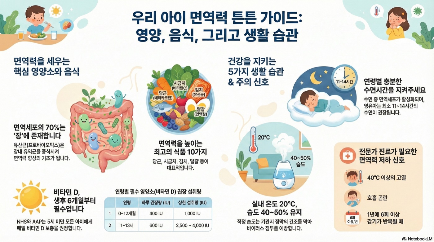 아이 면역력 관리의 핵심은 균형 잡힌 식단, 비타민D와 아연 보충, 그리고 충분한 수면입니다. 영국 NHS와 미국 소아과학회(AAP) 모두 만 5세 미만 아이에게 비타민D 보충을 권장하며, 장에 면역세포의 70%가 존재하므로 프로바이오틱스도 중요한 역할을 합니다.