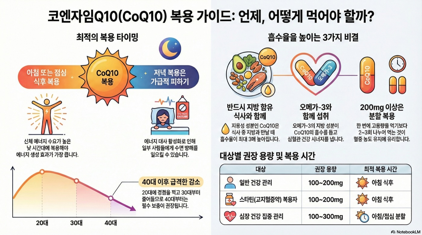 코엔자임Q10(CoQ10)은 아침 또는 점심 식후에 지방 함유 식사와 함께 복용하면 흡수율이 최대 3배 증가합니다. 저녁 복용은 수면 방해 가능성이 있어 피하는 것이 좋습니다. 대상별 권장량과 약물 상호작용까지 알아봅니다.