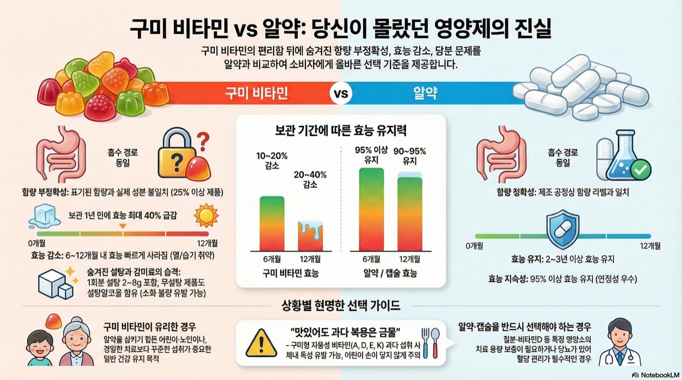 구미 비타민은 흡수율은 알약과 비슷하지만 성분 정확도·보관 안정성·설탕 문제가 있으므로, 정확한 효과를 원한다면 캡슐·정제가 더 안전한 선택입니다.