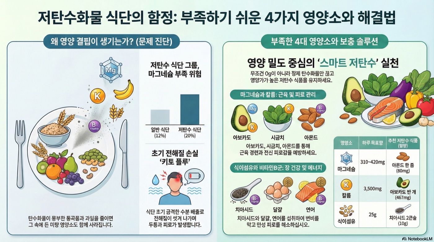 탄수화물을 줄이면 통곡물·과일·콩류 섭취가 함께 줄어, 마그네슘, 칼륨, 식이섬유, 비타민B군 4가지 영양소가 부족해지기 쉽습니다. 근육 경련, 피로, 변비, 구내염 등 증상이 나타난다면 식단 점검이 필요합니다.