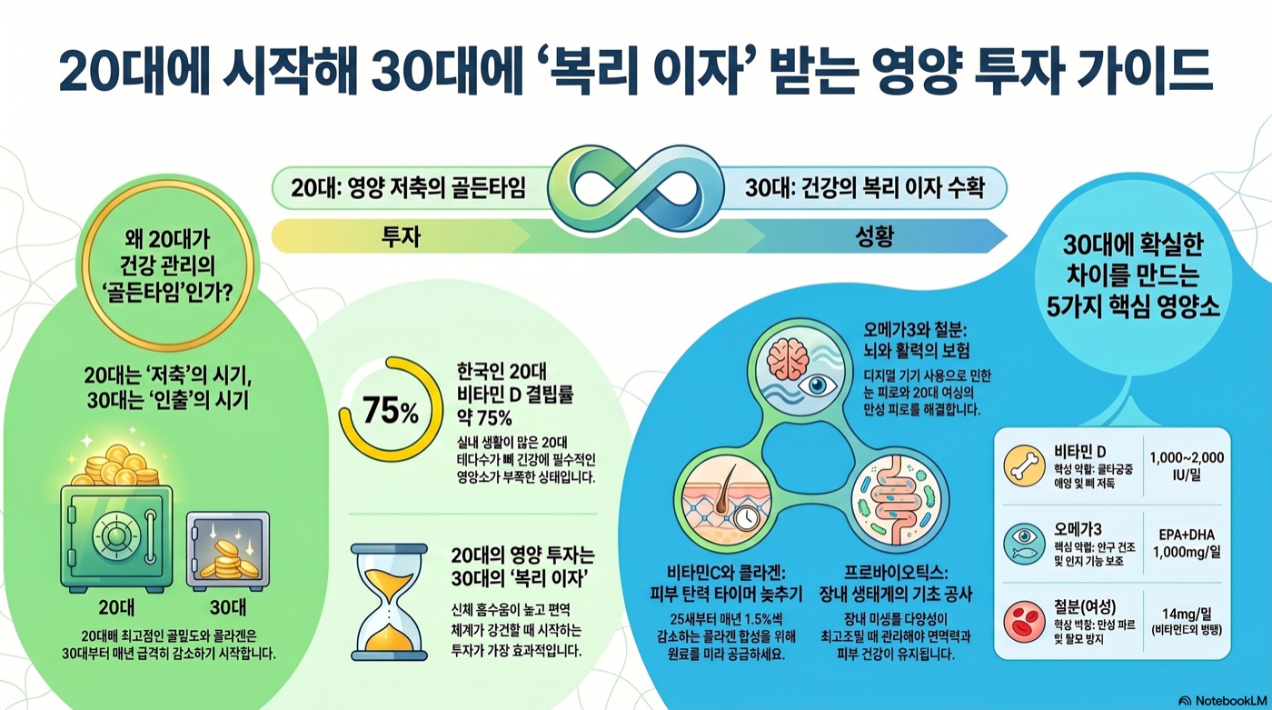 20대의 건강 투자는 30대에 복리 이자로 돌아옵니다. 비타민D·오메가3·철분·프로바이오틱스·비타민C — 이 5가지부터 시작하세요.
