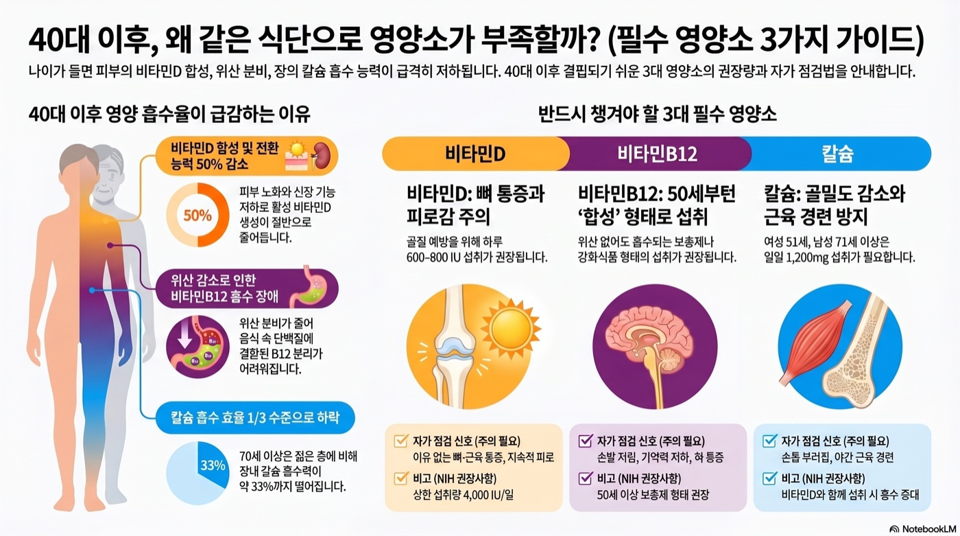 나이가 들수록 피부의 비타민D 합성 능력이 감소하고, 위산 분비가 줄어 B12 흡수가 어려워지며, 장에서의 칼슘 흡수 효율도 낮아집니다. NIH와 NHS 공식 자료를 기반으로, 40대 이후 특히 주의해야 할 영양소 3가지와 자가 점검법을 정리했습니다.