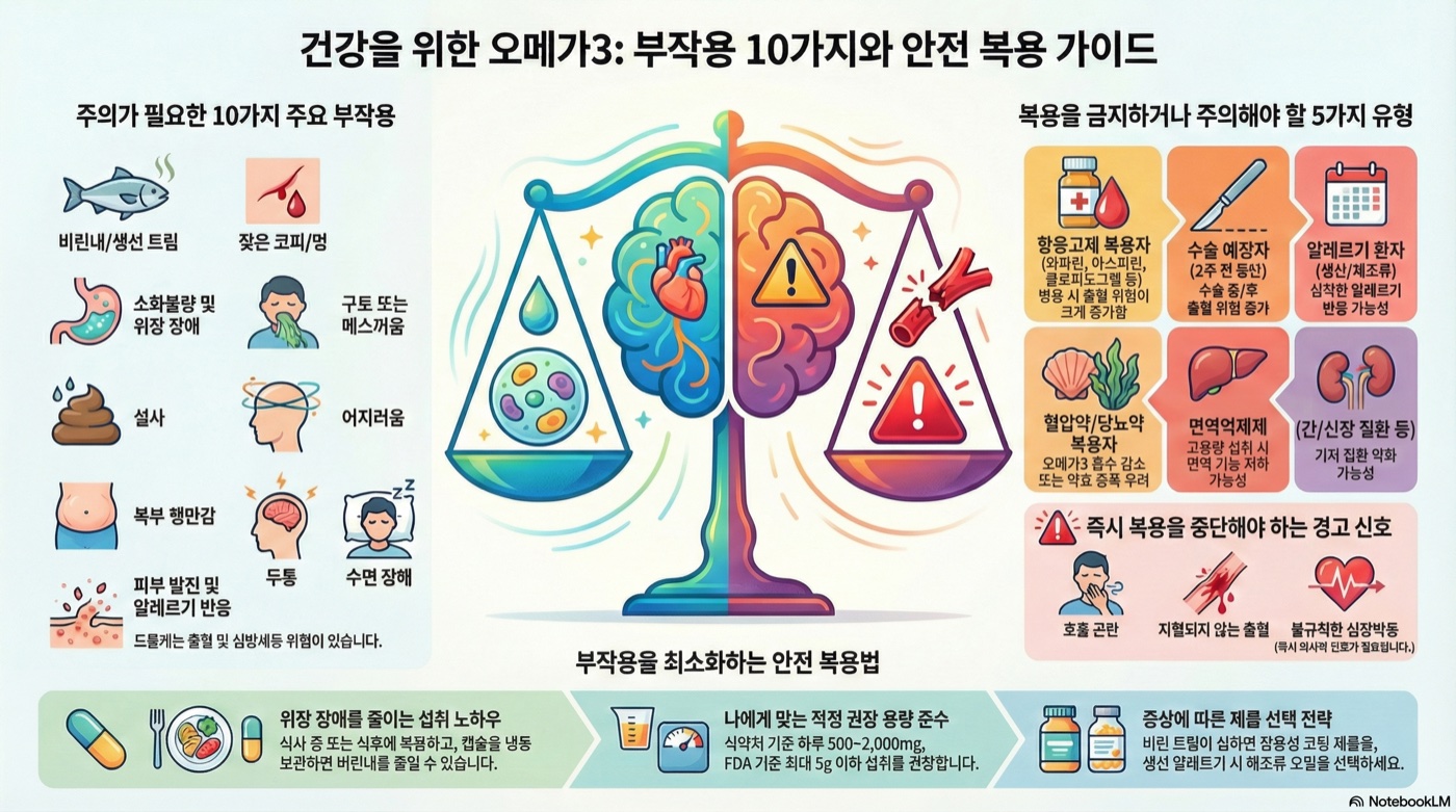 이 가이드에서는 의학적 근거에 기반한 오메가3의 10가지 부작용, 복용을 피해야 하는 5가지 유형, 그리고 부작용을 최소화하는 올바른 복용법을 알려드립니다.