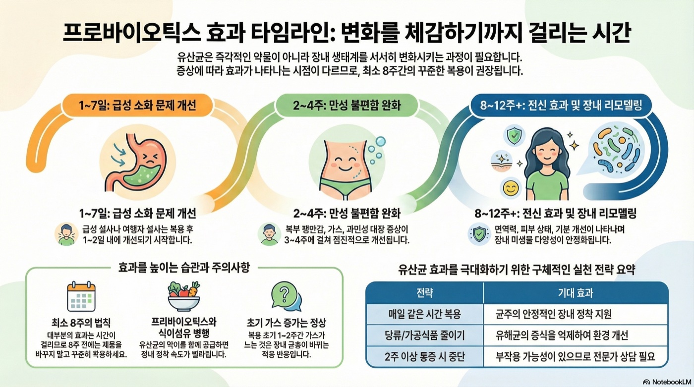 급성 설사는 12일, 더부룩함·가스는 24주, 면역력·피부 같은 전신 효과는 8~12주가 일반적인 임상 타임라인입니다. 최소 8주는 꾸준히 복용한 뒤 효과를 판단하세요.