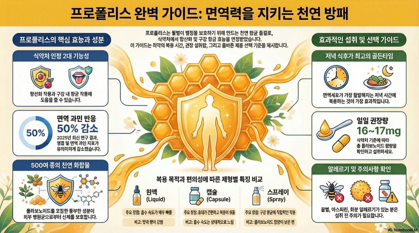 프로폴리스는 꿀벌이 만든 천연 항균 물질로, 식약처에서 항산화 작용과 구강 건강에 대한 기능성을 인정받았습니다. 면역력 강화를 위해서는 플라보노이드 16~17mg이 함유된 제품을 저녁 식후에 섭취하는 것이 효과적입니다.
