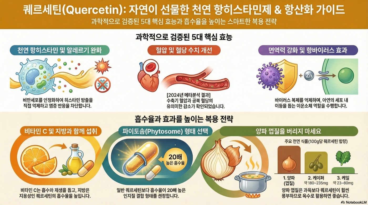 퀘르세틴은 양파·사과에 풍부한 천연 항히스타민제이자 항산화 플라보노이드입니다. 알레르기 완화, 혈압 개선, 면역력 강화, 항산화·항염 등 5대 효능과 흡수율 높이는 복용법을 알아보세요.
