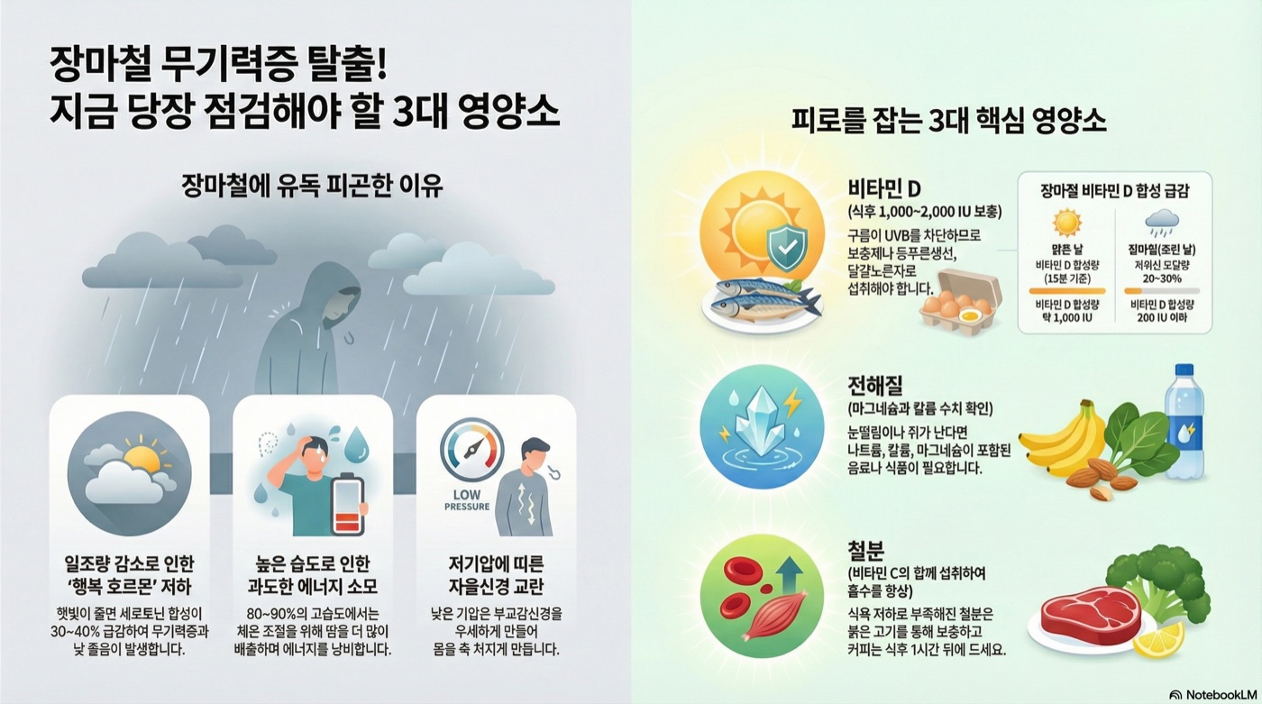 장마철 피로의 주범은 비타민D 합성 급감, 전해질(나트륨·칼륨·마그네슘) 손실, 철분 섭취 저하 3가지입니다. 날씨를 바꿀 수는 없지만 영양 상태를 점검하면 피로를 크게 줄일 수 있습니다.