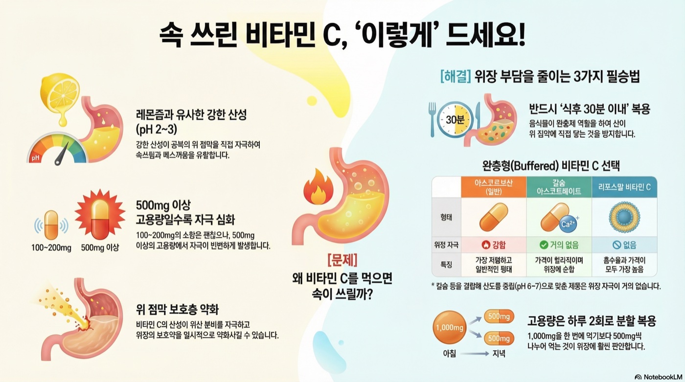 비타민C(아스코르브산)는 **산성 물질(pH 2~3)**이기 때문에, 빈 위에 들어가면 위 점막을 직접 자극하여 속쓰림·메스꺼움을 유발합니다. 식후에 복용하거나 에스터C·칼슘 아스코르베이트 같은 완충형(buffered) 비타민C로 바꾸면 위장 불편 없이 동일한 효과를 얻을 수 있습니다.