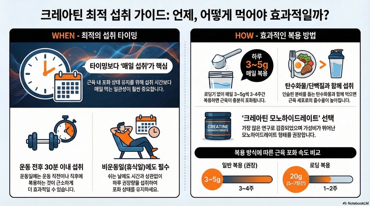 크레아틴 타이밍보다 매일 3-5g 꾸준히 먹는 습관이 훨씬 중요하며, 운동일에는 운동 직전·직후가 가장 무난한 선택입니다.