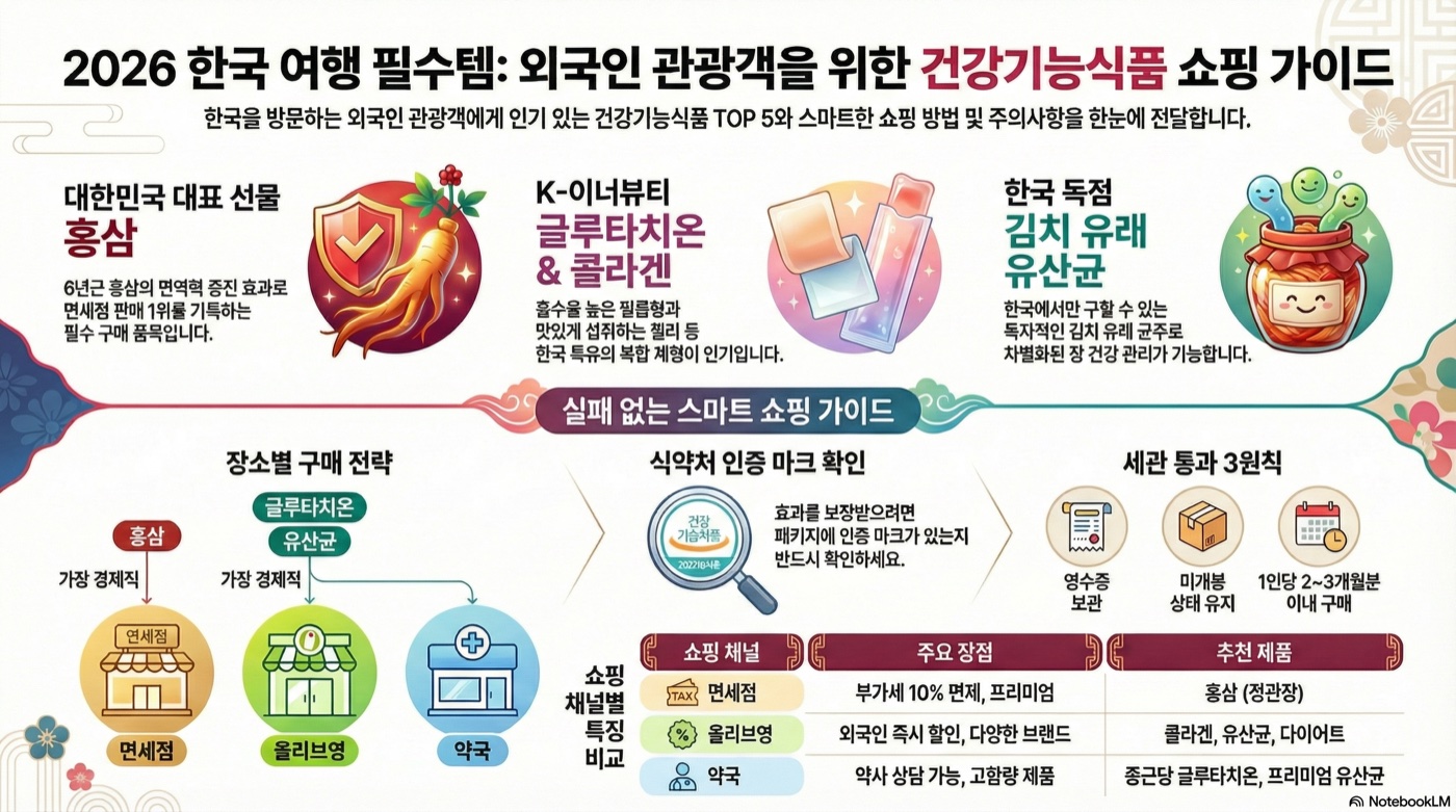 2025년 기준 올리브영의 외국인 관광객 매출은 1조 원을 돌파했으며, 건강기능식품은 K-뷰티에 이어 외국인이 가장 많이 구매하는 카테고리 2위로 부상했습니다. 특히 홍삼, 글루타치온, 유산균, 콜라겐, 다이어트 보조제가 TOP 5를 차지합니다. 이 글에서는 각 제품의 인기 이유와 면세점·올리브영·약국별 쇼핑 팁을 정리합니다.