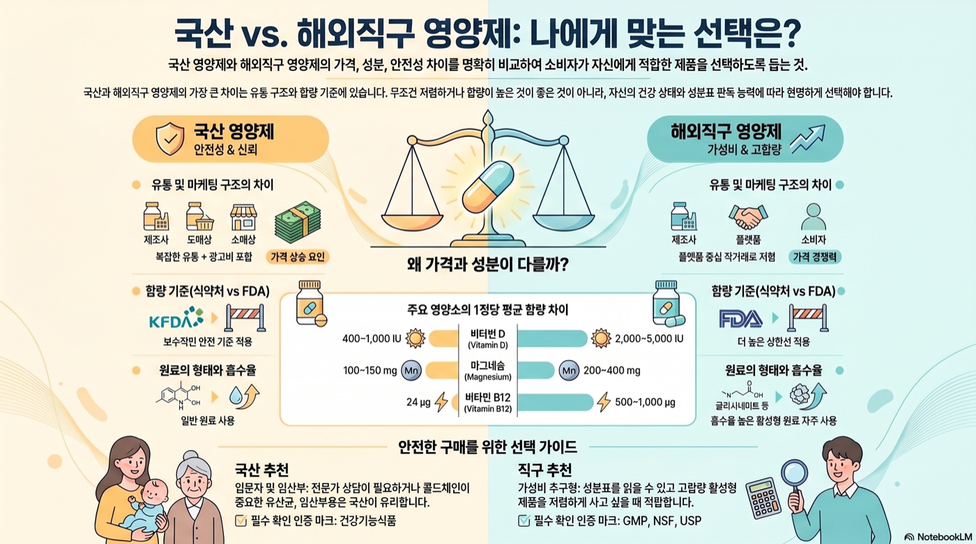 가격 차이의 주 원인은 함량, 유통 구조, 마케팅 비용입니다. 해외직구(특히 미국) 영양제는 일반적으로 함량이 높고 가격이 낮지만, 국산은 식약처 인증·한글 표기·유통 관리에서 안심할 수 있습니다. 중요한 건 브랜드 국적이 아니라 성분표를 읽는 능력입니다.