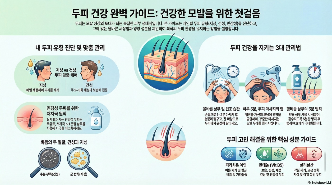 두피는 건강한 모발의 토대입니다. 비듬, 지루성 두피염, 가려움증 등 흔한 두피 문제의 원인과 올바른 샴푸 사용법, 두피 마사지, 두피에 좋은 성분까지 두피 건강 관리의 모든 것을 알아봅니다.