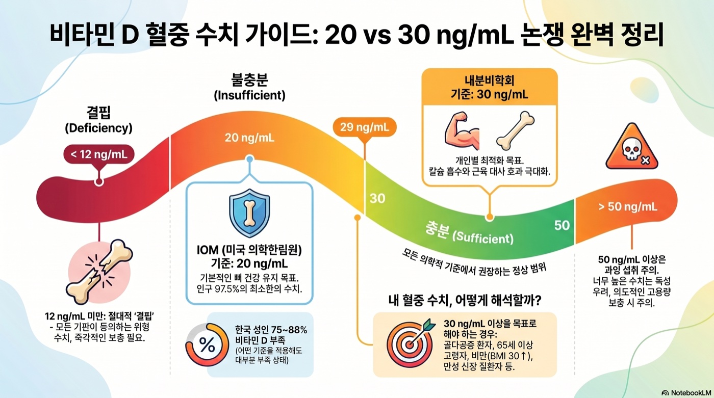 건강한 성인이라면 IOM 기준(20ng/mL 이상)을 기본으로 삼는 것이 현재 근거에 부합합니다. 다만, 아래 해당 사항이 있다면 30ng/mL 이상을 목표로 주치의와 상의하세요.